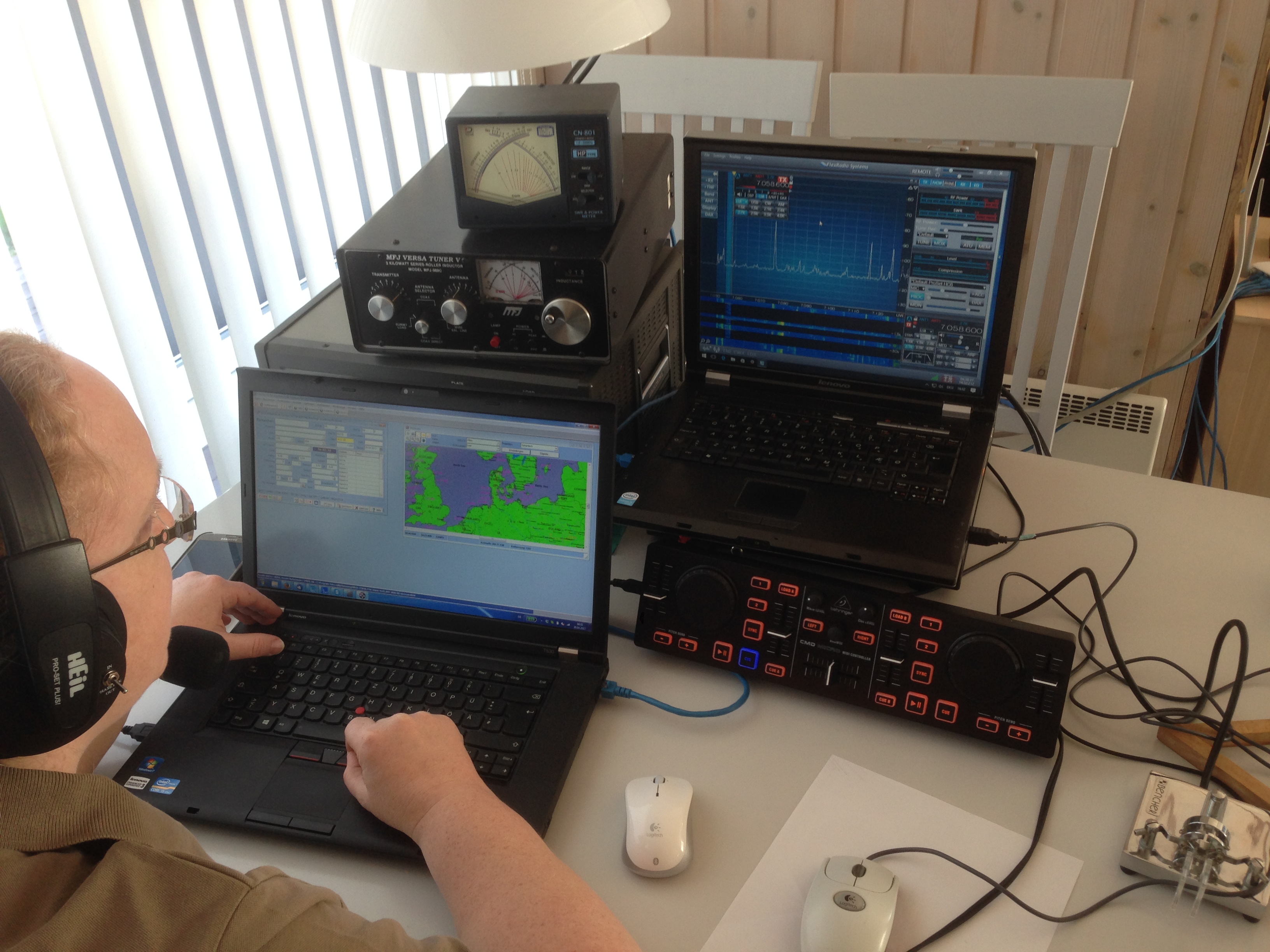 Auf dem Laptop läuft derzeit nur die Logsoftware. Links auf dem PiPO (Mini-PC mit Touchdisplay) läuft die Steuerungssoftware für das SDR, am PiPO ist ebenfalls die DJ-Konsole angeschlossen um den TRX doch etwas klassisch bedienen zu können. Dank der TL-922 auch mit etwas mehr Leistung. :-)