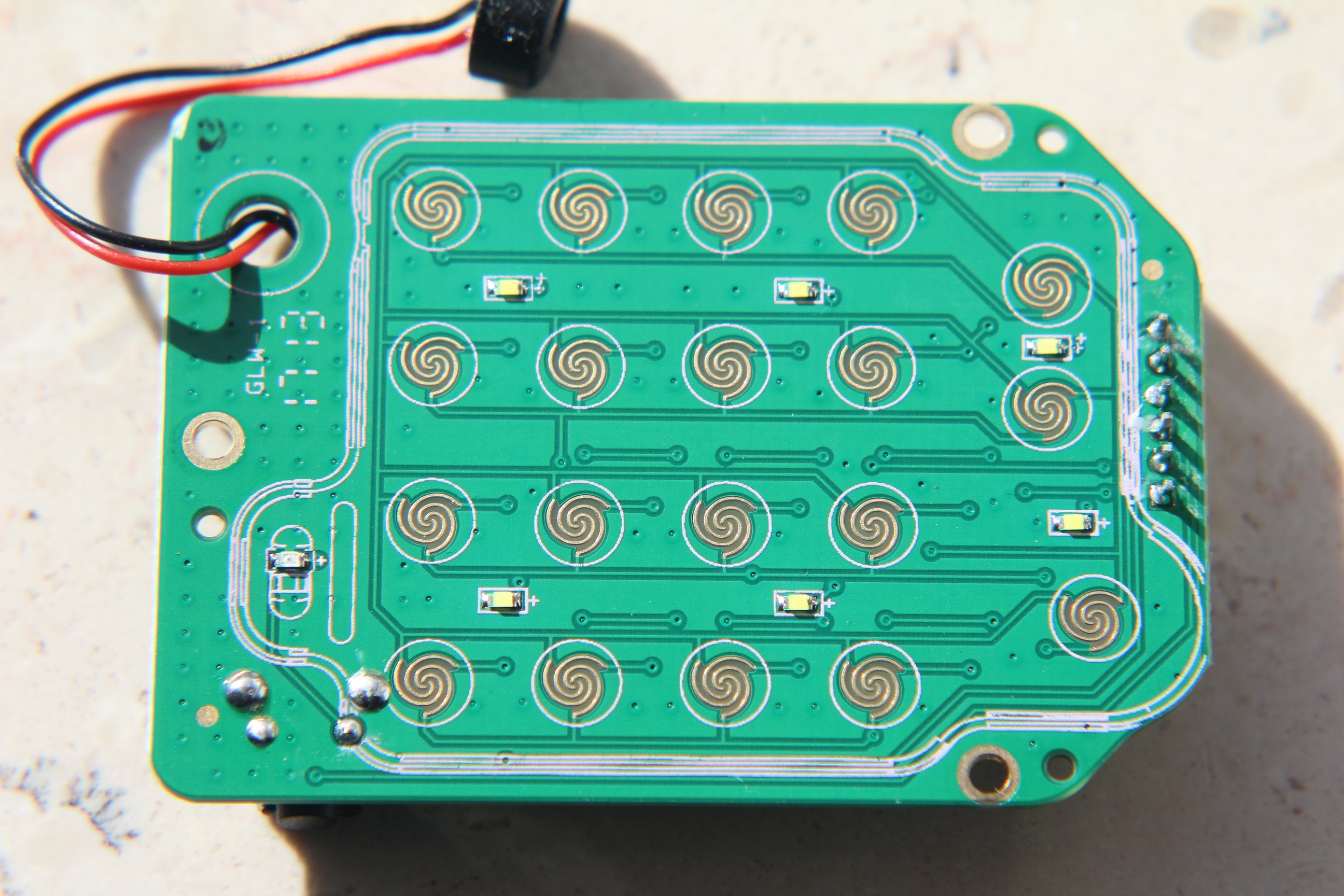Auf der Rückseite sind ein paar LED´s zur Beleuchtung und die Kontakte für die Tastatur am Mikro.