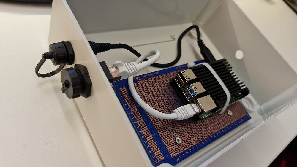 Während der Wartezeit bin ich dann auf das openwebrx-Projekt gestoßen. Ein Raspberry Pi 4 lag hier noch rum und einen abgesetzten RX zu haben, um mal am Handy das Band zu checken schien mir ganz verlockend. Also wurde noch ein SdrPlay RSP1A geordert. Sodass nun die Basiskomponenten bereitlagen: Begonnen habe ich damit, den Raspi und SDR in eine Box zu bauen, die ich später im Carport unterbringen kann. Ich wollte kein Koax dafür bis ins Shack ziehen.